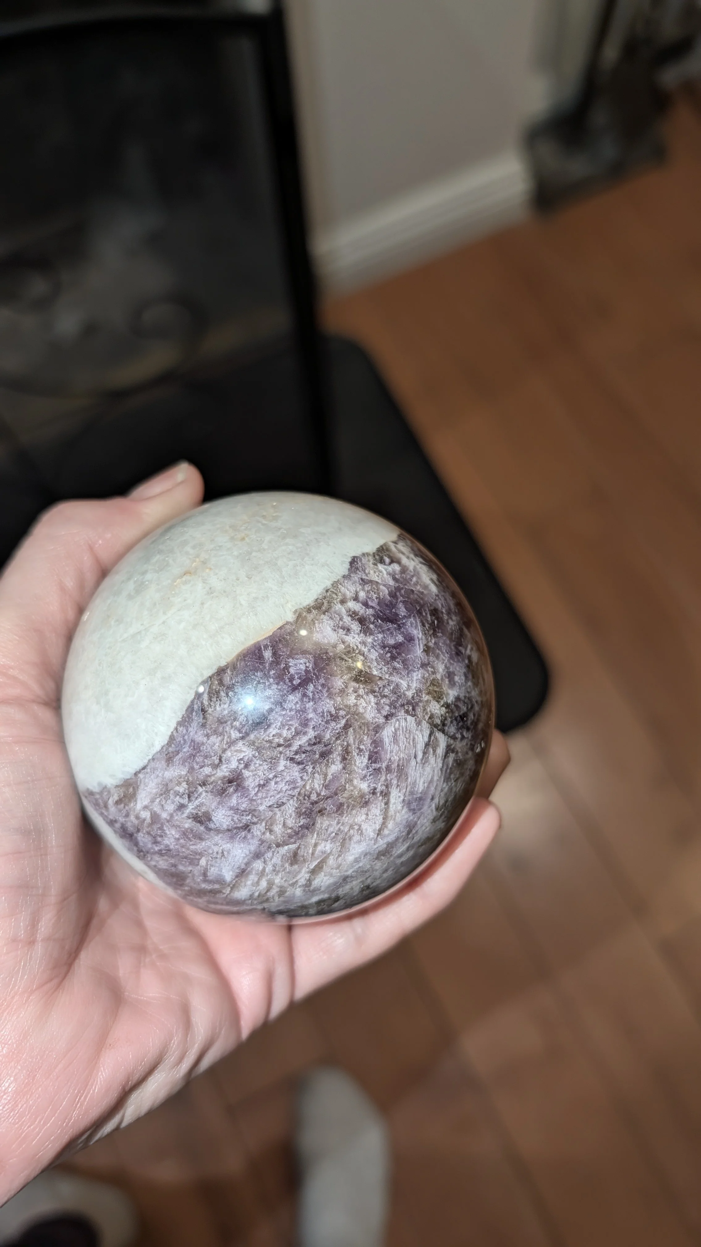 A rare find featuring a distinct 50/50 split between snowy white quartz and rich, included amethyst.